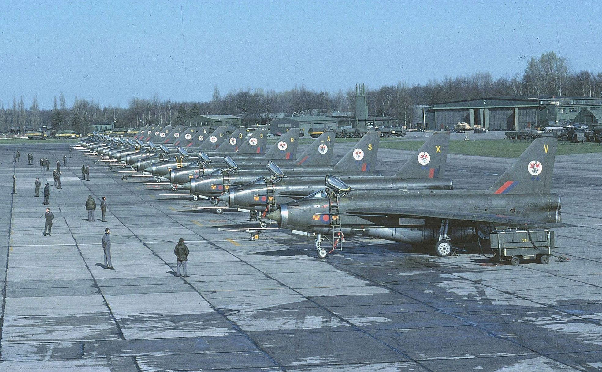 Leconfield, 1965. A kék gerincű gépek a 92. századéi, de más alakulatoktól is vannak Lightningok a háttérben. A kép a dátum alapján valószínűleg nem sokkal a század Németországba telepítése előtt készült